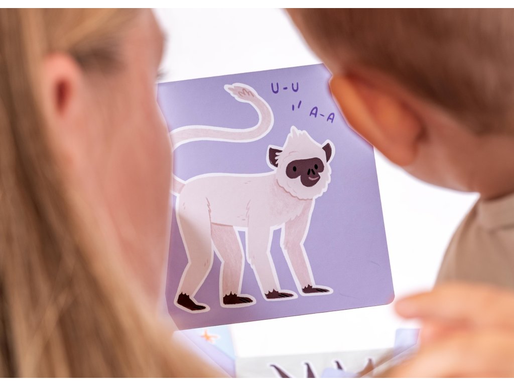 První zvuky – první slova. Hra, která přirozeně rozvíjí řeč napodobováním zvuků. Jednoduché a srozumitelné obrázky jsou doplněny grafickou nápovědou – děti napodobují zvuky, poznávají motivy a rozvíjejí komunikační schopnosti i sluchové vnímání.