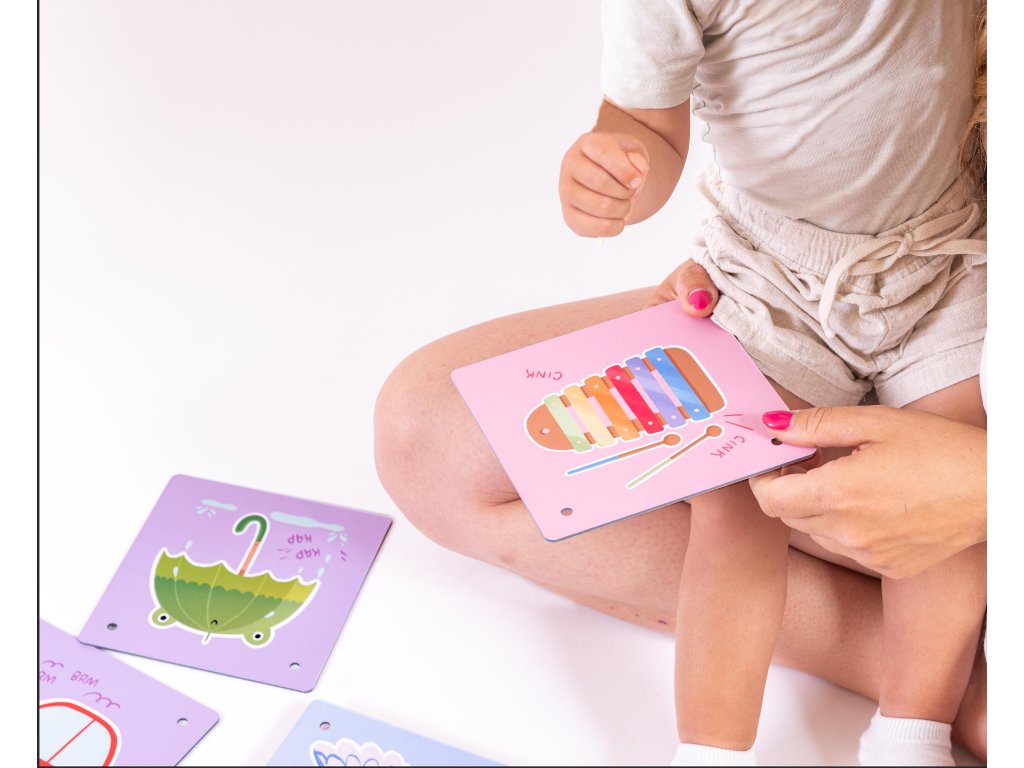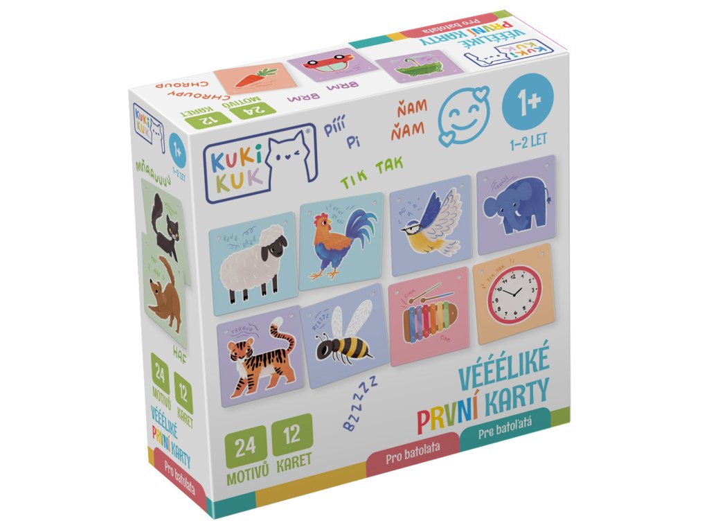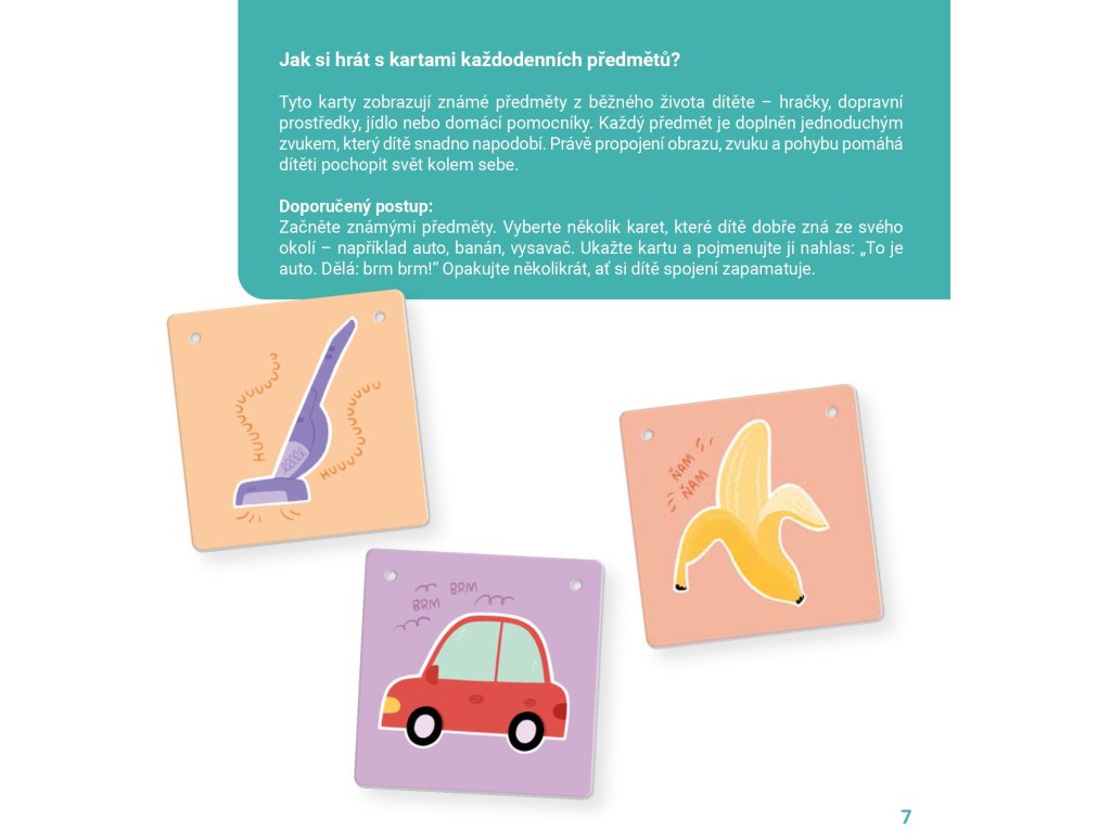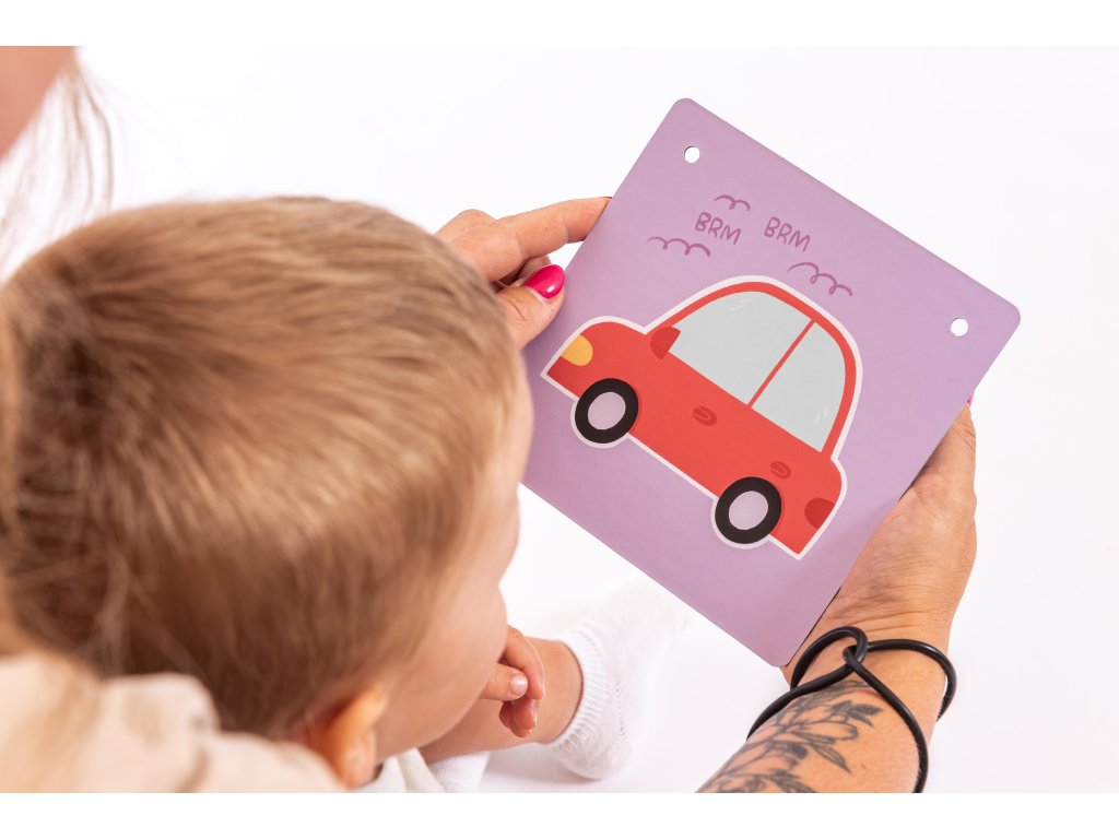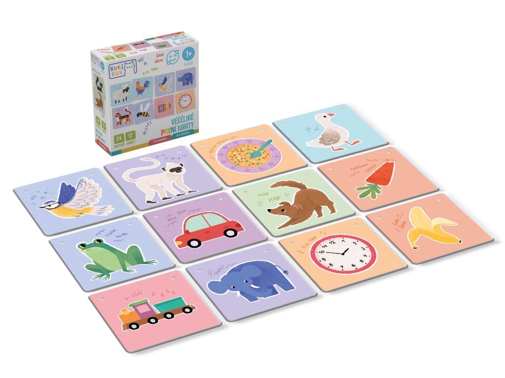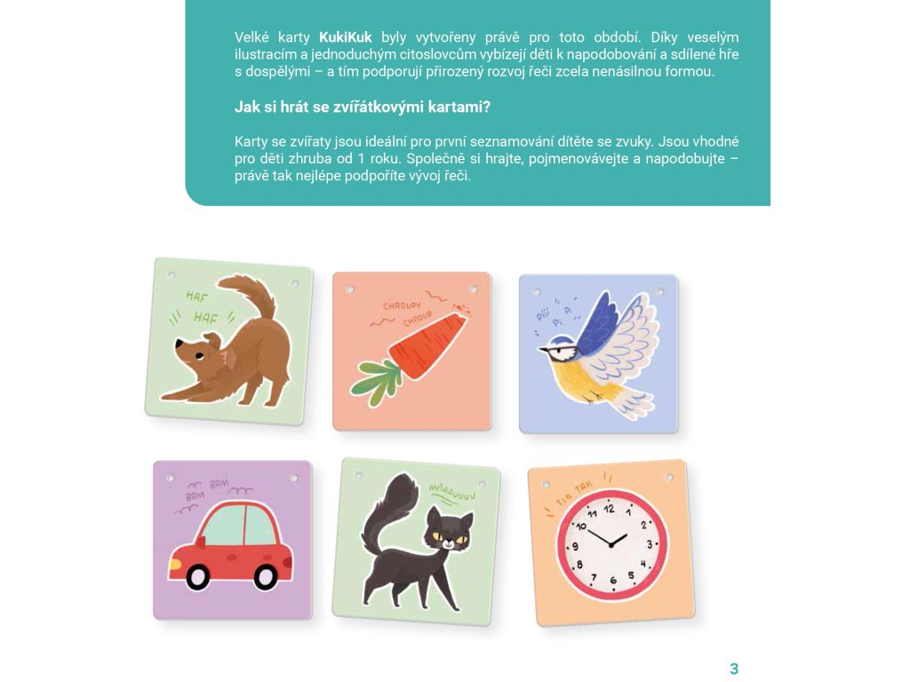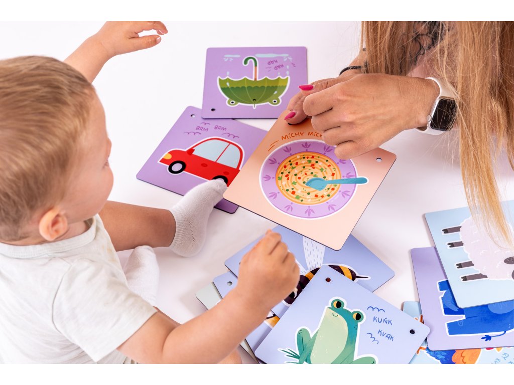 Ideální pomůcka před prvními slovy – dítě může na obrázky reagovat zvukem dřív, než začne mluvit. Sada výborně navazuje na KukiKuk kontrastní karty pro miminka.