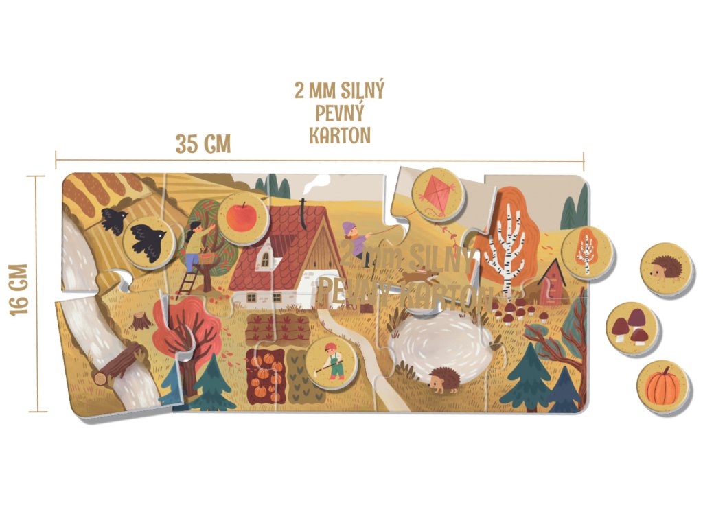 • 4 velká desetidílná puzzle (jaro, léto, podzim, zima) – celkem 40 dílků, velikost každého puzzle 35 × 16 cm