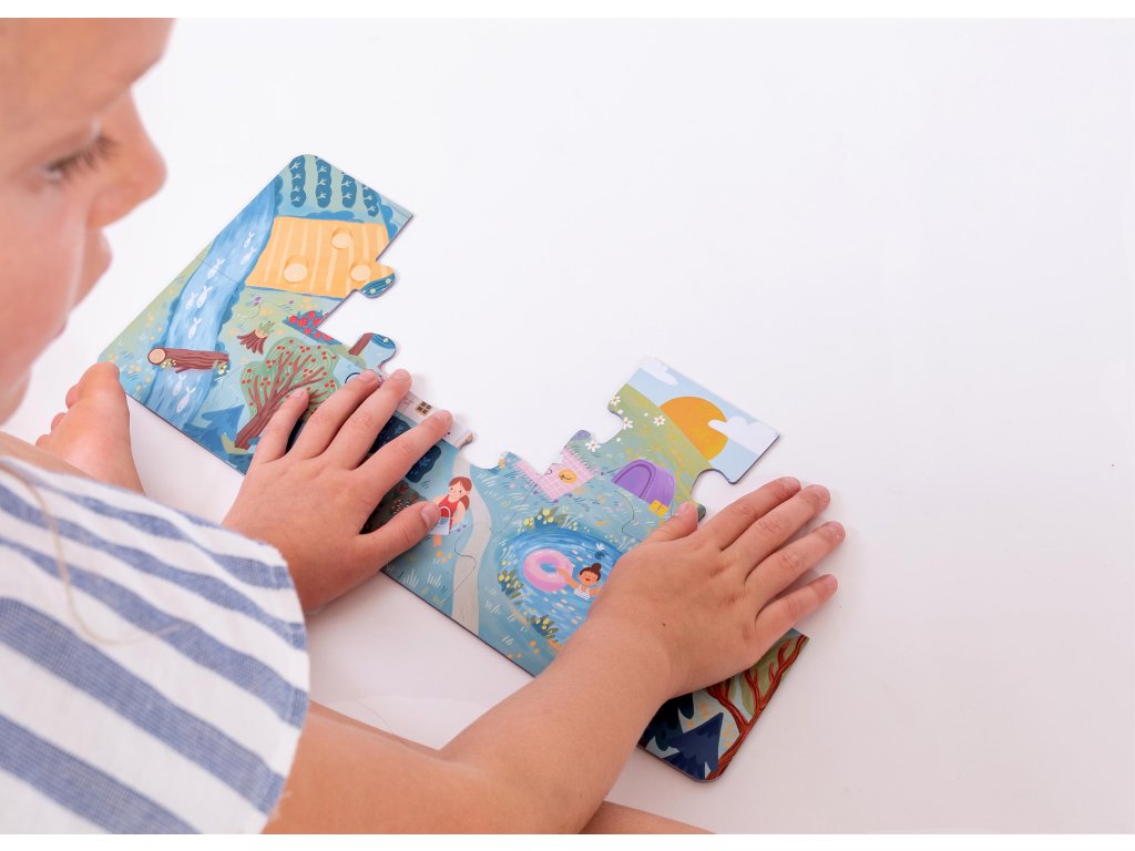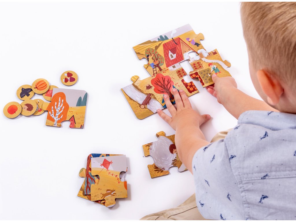 Čtyři roční období jako velké obrázkové puzzle pro děti od 2 let. Každé období tvoří velké puzzle o 10 dílcích (35 × 16 cm) a 8 tematických žetonů (Ø 3,5 cm) s detaily – dítě je hledá, přiřazuje a třídí k jednotlivým puzzle.