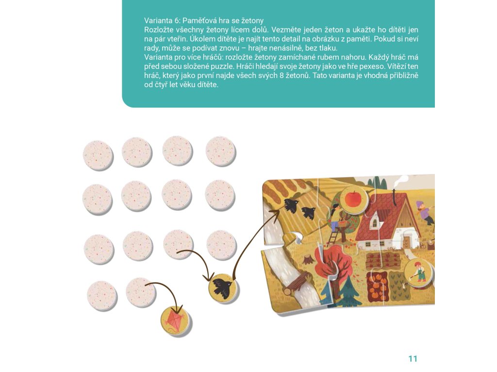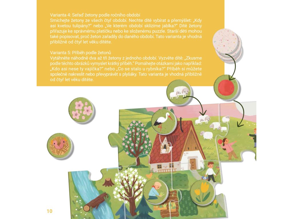 V Radách pro rodiče najdete 4 herní varianty, jak žetony i puzzle využít (třídění podle období, hledání detailů, vyprávění příběhů aj.).