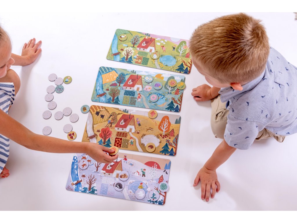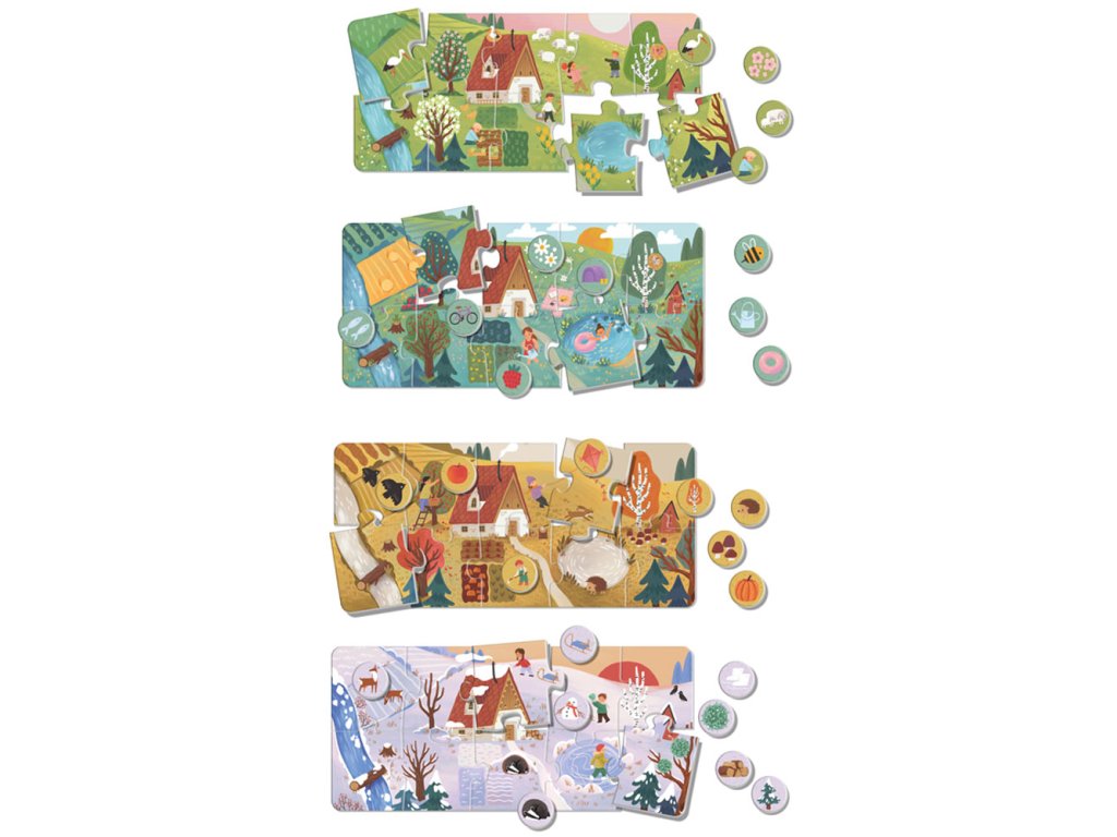 Tato hra přináší čtyři krásné scény: jaro, léto, podzim a zimu. Každé období děti skládají z 10 velkých dílků a k hotovým obrázkům přiřazují 8 kulatých žetonů s motivy z daného ročního období – trénují tak postřeh i logické myšlení.