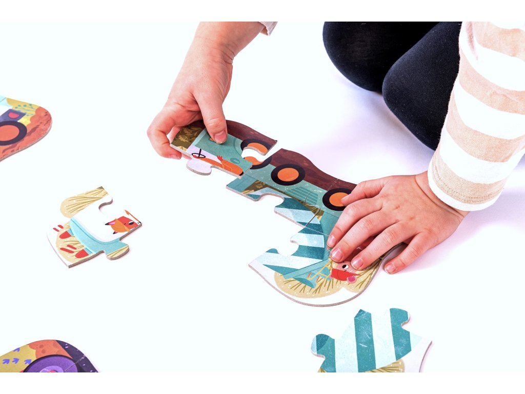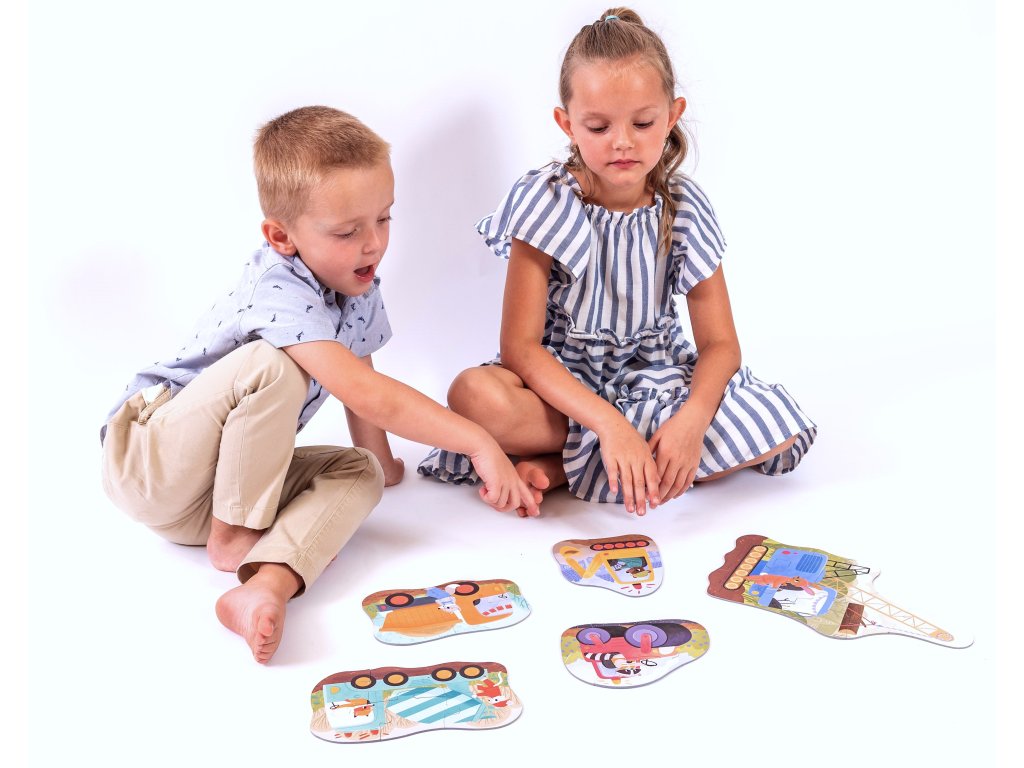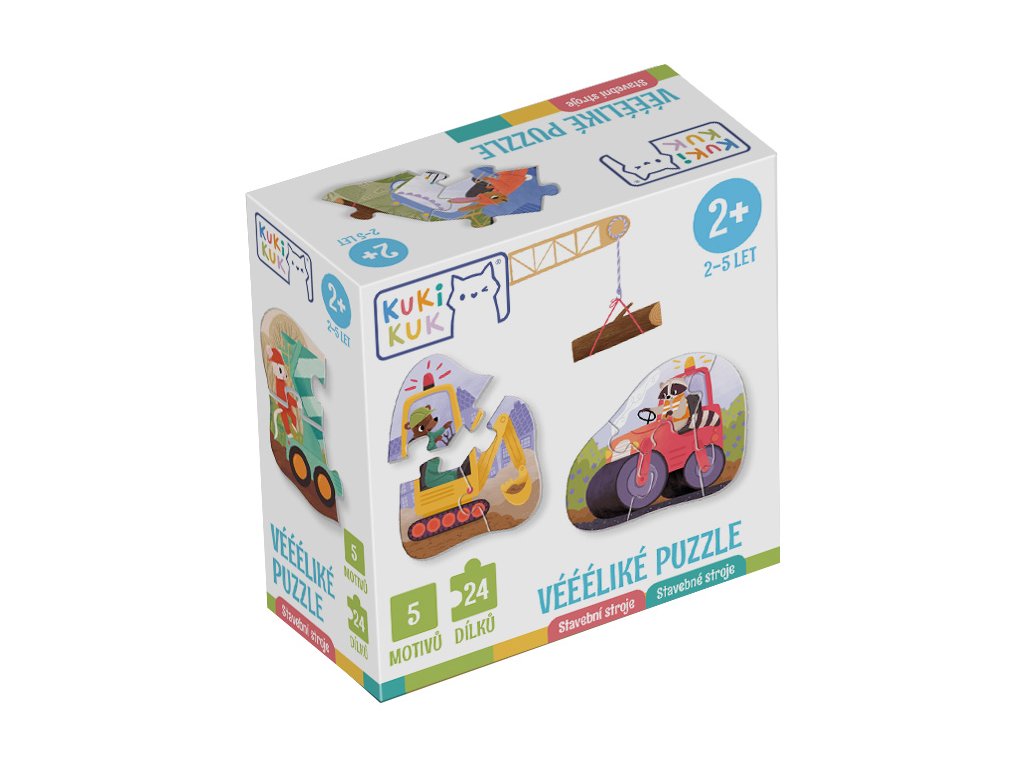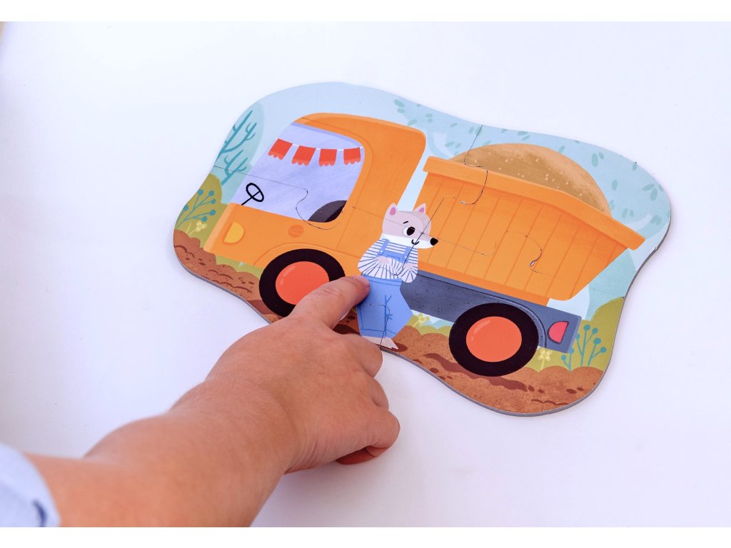 Veselé puzzle pro malé stavitele od 2 let. Malé děti si snadno poradí s extra velkými a 2 mm silnými pevnými dílky. Obsahuje 5 různých stavebních strojů – od jednoduchých dvoudílných po velké sedmidílné puzzle, které má rozměry 31 x 20 cm!
