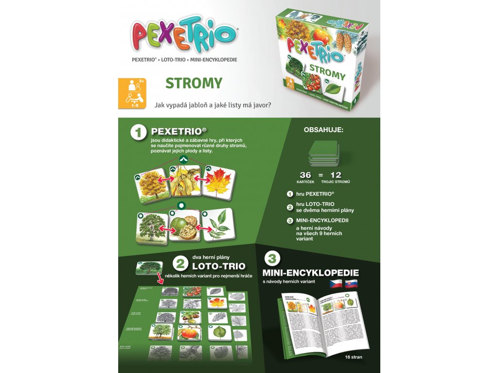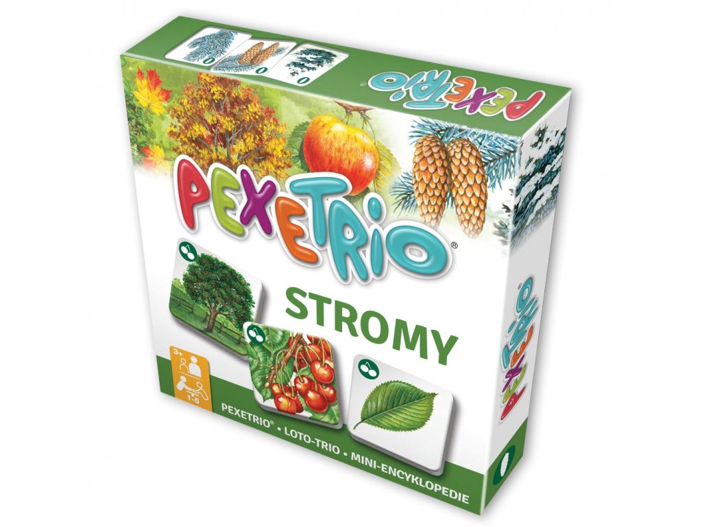 Pexetrio STROMY je zábavná hra inspirovaná pexesem, která děti zároveň i vzdělává. Děti se naučí pojmenovat různé druhy stromů, poznávat jejich plody a listy podle hesla „škola hrou“. Kromě toho, že si děti osvojí stromy zábavným způsobem, hra také napomáhá rozvíjet jejich logické myšlení a trénovat paměť hledáním trojice kartiček s obrázky stromů, jejich listů a plodů.