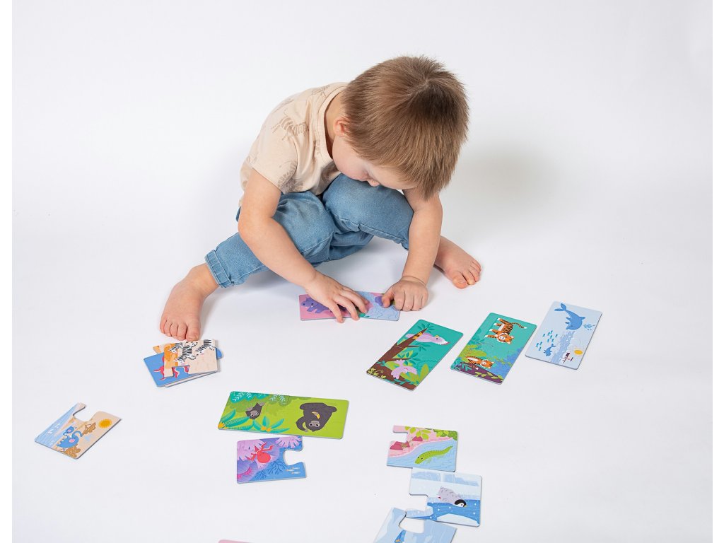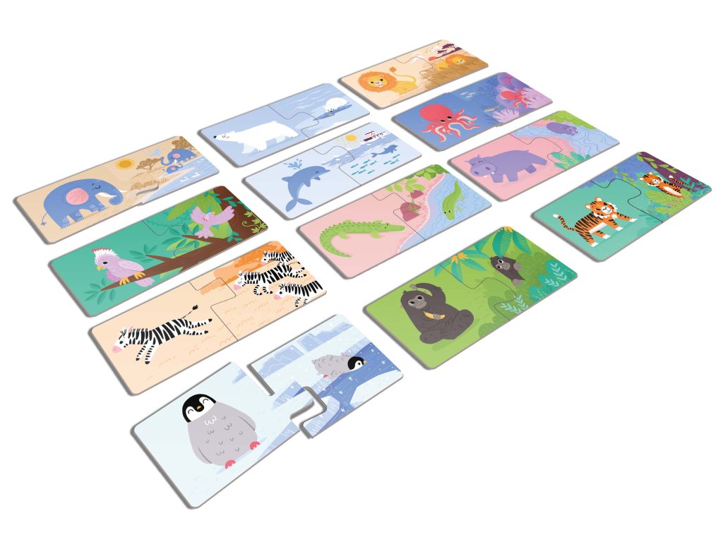Puzzle DUO je vytvořeno tak, že linie spojovacích částí má takový tvar, aby šly spojit pouze správné obrázky, které patří k sobě. Zobrazují 12 různých zvířat v jejich přirozeném prostředí.